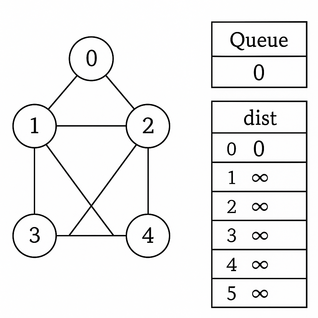 dist[source] = 0because the source is distance 0 from itself. - Place the source node into the queue.