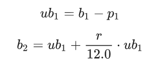 In month 1, we will make another payment, p1. That payment has to cover some of the interest costs, so it does not completely go towards paying off the original charge. The balance at the beginning of month 2, b2, can be calculated by first calculating the unpaid balance after paying p1, then by adding the interest accrued: