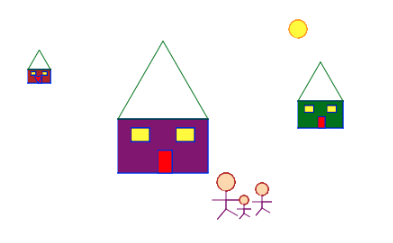 - Make a function buildNeighborhood(t) that displays 3 houses, and 5 people (using drawScalableHouse and drawScalablePerson). Your goal is to try to make the sizes of the elements in a range that makes sense (not to big or small), and that are actually on the screen (not in some far of location). The program should also put a sun in the sky using the built-in circle function.