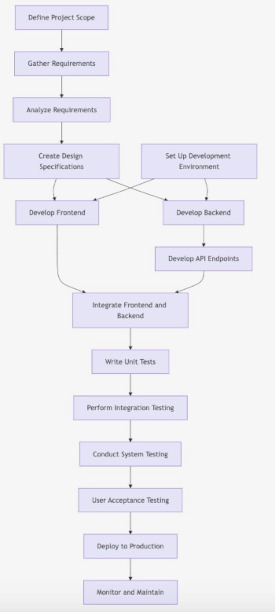 A[Define Project Scope] --> B[Gather Requirements] B --> C[Analyze Requirements] C --> D[Create Design Specifications] D --> E[Develop Frontend] D --> F[Develop Backend] G[Set Up Development Environment] --> E G --> F E --> H[Integrate Frontend and Backend] F --> I[Develop API Endpoints] I --> H H --> J[Write Unit Tests] J --> K[Perform Integration Testing] K --> L[Conduct System Testing] L --> M[User Acceptance Testing (UAT)] M --> N[Deploy to Production] N --> O[Monitor and Maintain]
