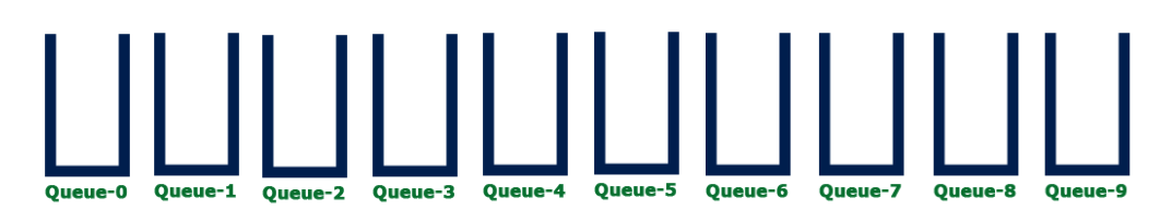 - Step 1 – Define 10 queues each representing a bucket for each digit from 0 to 9.