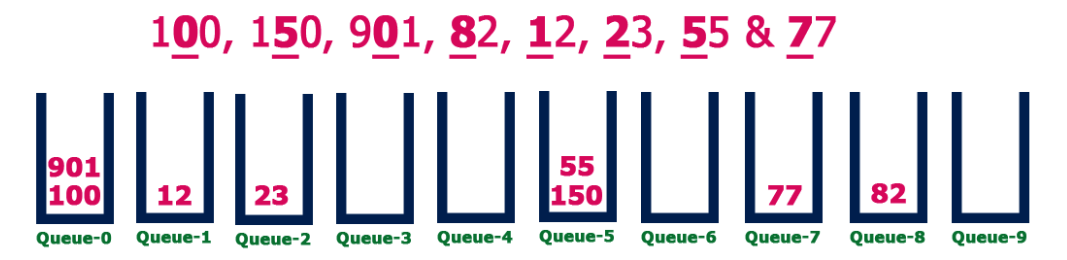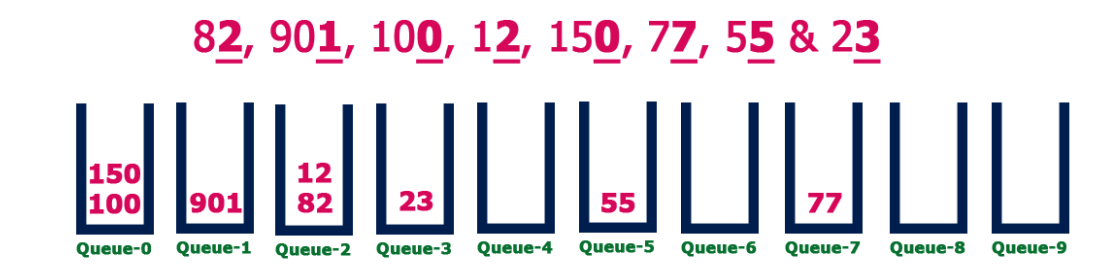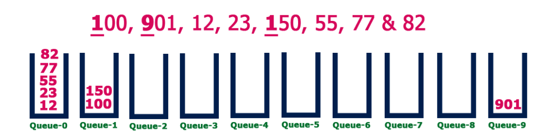 - Step 3 – Insert each number into their respective queue based on the least significant digit.