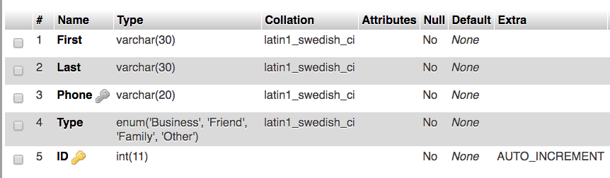 Note the “AUTO_INCREMENT” for the ID field. This field is used as the unique ID for every row, and can be used for unambiguously referring to a record when changing or deleting. The “AUTO_INCREMENT” attribute assigns unique inter values for each record in a sequence. To do this click the “A_I” box for the field (you must scroll to the right to see it). This check box is available both then creating the table, and when editing the structure.