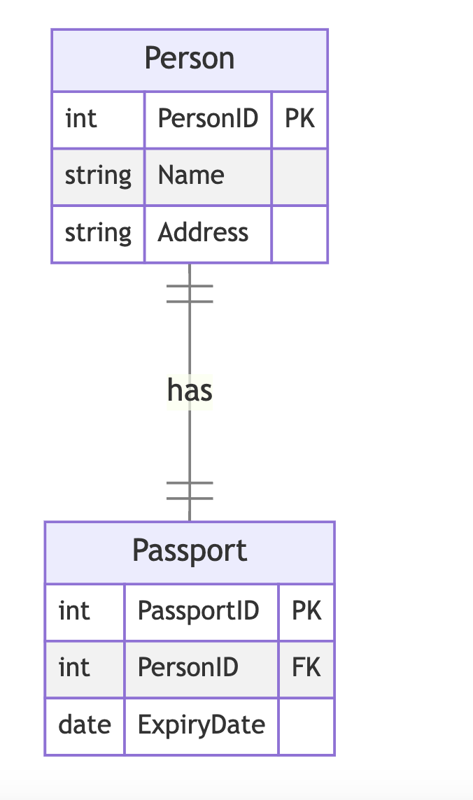 Example: A Person entity and a Passport entity. Each person has one passport, and each passport belongs to one person.
