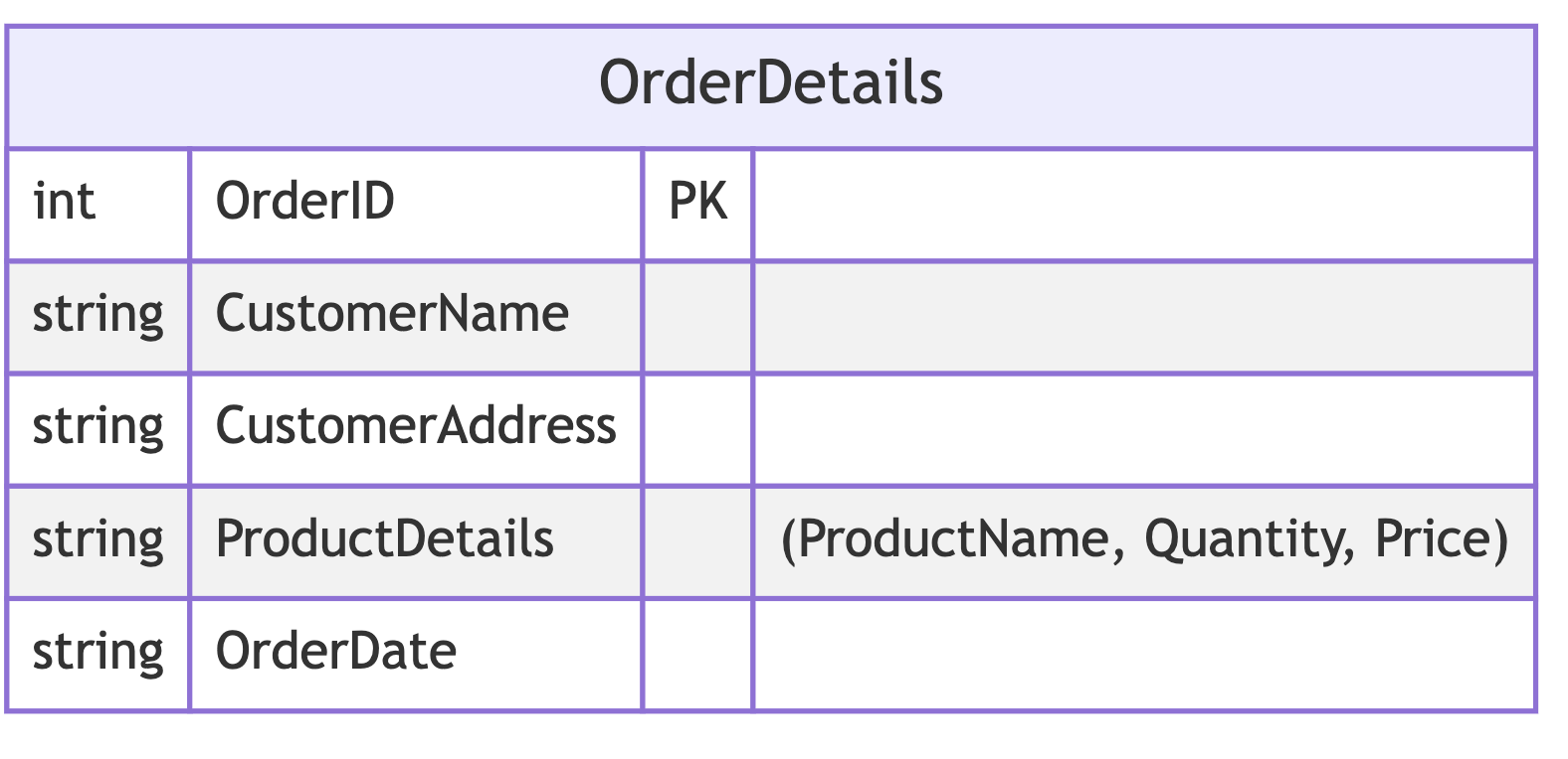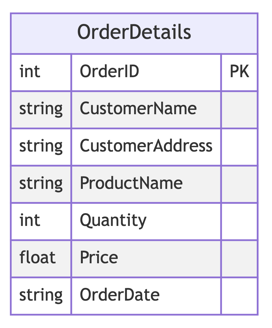 | OrderID | CustomerName | CustomerAddress | ProductDetails | OrderDate |