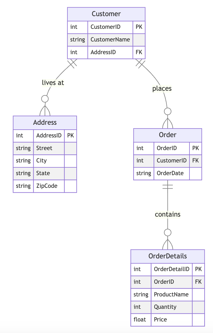 In this activity, we will start with an unnormalized database consisting of five tables and progressively normalize them into Third Normal Form (3NF). Each step will be illustrated using Mermaid diagrams.