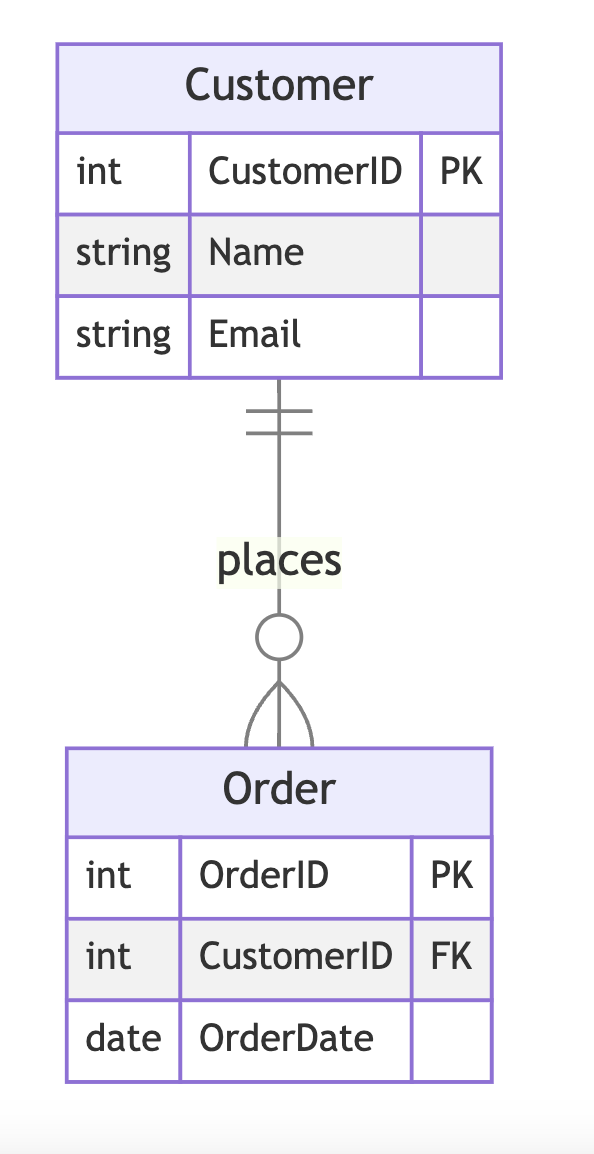 Example: A Customer entity and an Order entity. A customer can place multiple orders, but each order is placed by one customer.