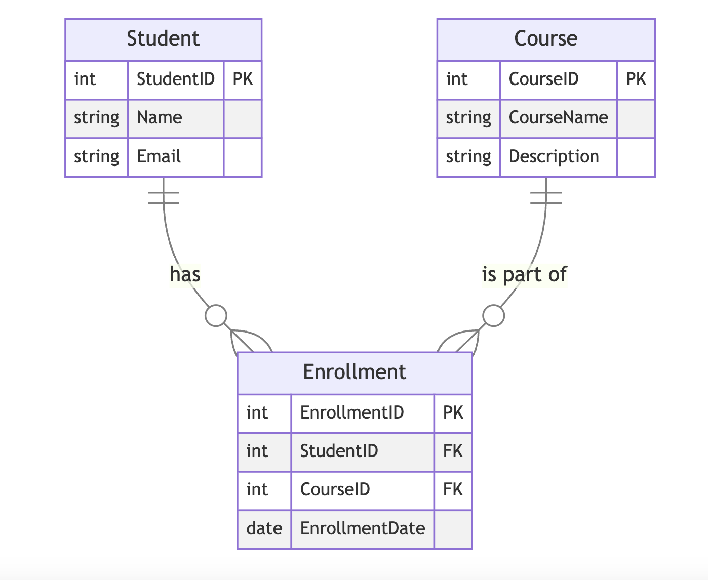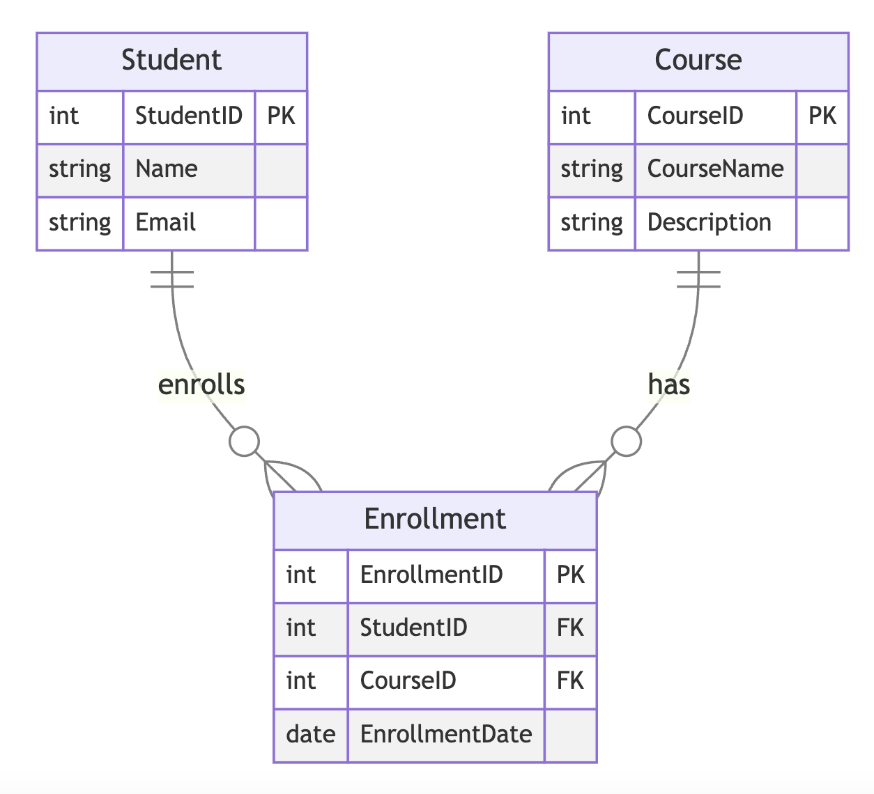 Student ||--o{ Enrollment : "has"