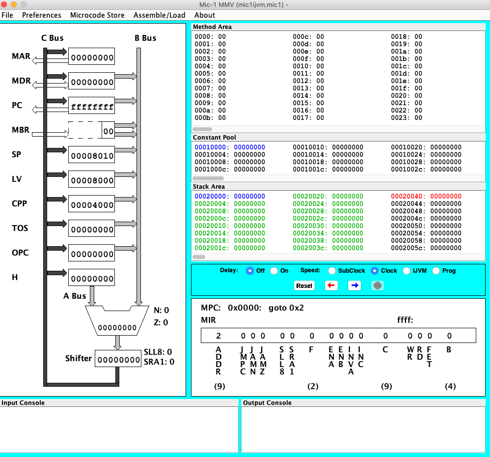 mic1 is a Java-based simulator which implements the Mic-1 microarchitecture described in Chapter 4 of Andrew S. Tanenbaum, Structured Computer Organization. The Mic-1 has been microcoded to implement a simplified (interger only) version of the Java Virtual Machine, IJVM.