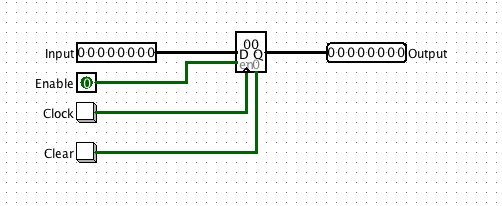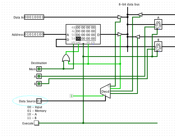Below I have created a simple data bus with 4 inputs – a manual input, a memory, and two registers (labeled A and B). The registers have an input (D), an output (Q), an enable (en), and a clock input.