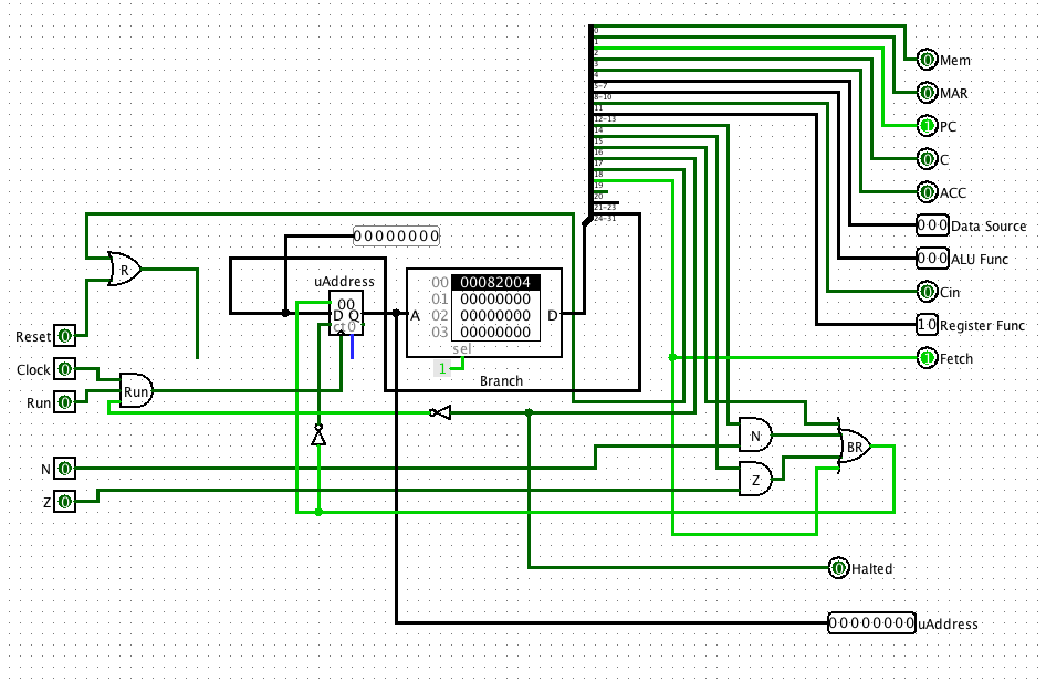 | Branch Address | Unused | Reset | Halt | Uncond Branch | Z | N | Reg Func | Cin | ALU Func | Data Source | ACC | C | B | MAR | Mem |