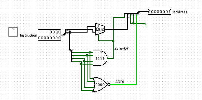 - In the case where the opcode is 0 (0000) (ADDI), then set to low bit (0) to 1 so that we avoid using memory address 0.