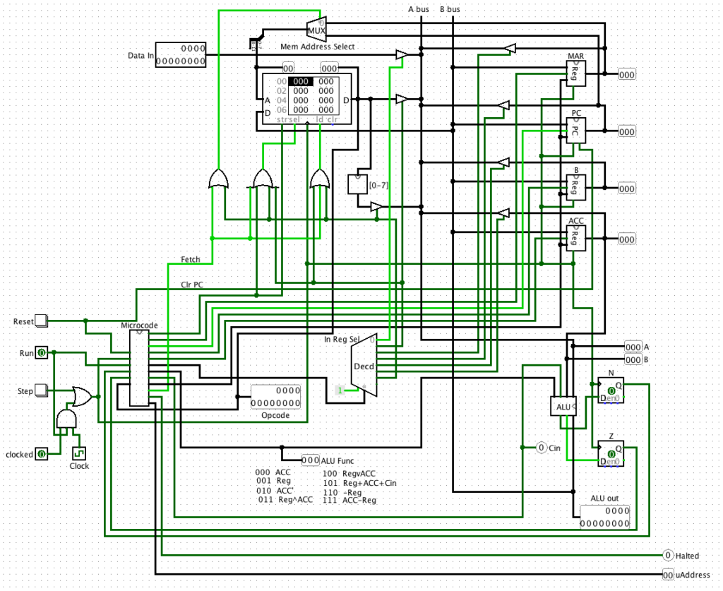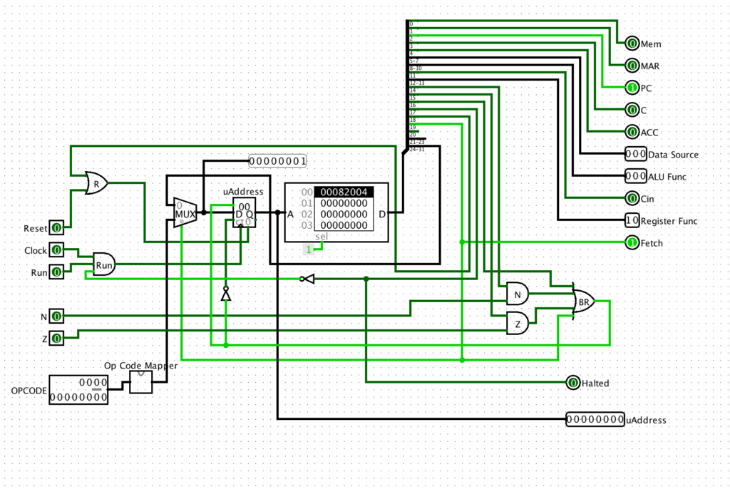 | Branch Address | Unused | Fetch | Reset | Halt | Uncond Branch | Z | code N | Reg Func | Cin | ALU Func | Data Source | ACC | B | PC | MAR | Mem |