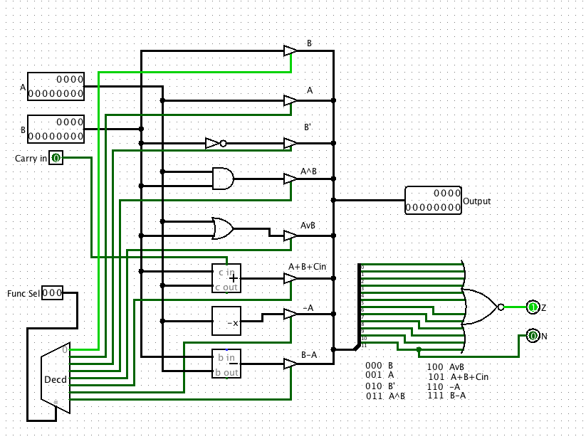 The solution is the flip flop. At the end of every CPU cycle, the current output of the Z and N bits are locked into the flip flops, then on the NEXT cycle, the Z and N bits represent the previous state of these bits. So any decision needs to be made exactly one clock cycle after the ALU computes a result. - Another ALU change (sorry). In order for the Z and N bits to be useful, they need to read meaningful data from the output of the ALU. Basically this designe will sense the output of the ALU at the end of each operation, and these values will be available for the next clock cycle. But what about operations that don’t involve the ALU (like branch, fetch, NOP). After some thought, I realized that the BEST default behavior is to have the ACC pass through the ALU if nothing else was done with the ALU. So I rearranged the ALU to have the B input (the ALU) be the default (e.g. when the function bits are 000). BELOW is a modified ALU, and an actual download of it to speed things up:
