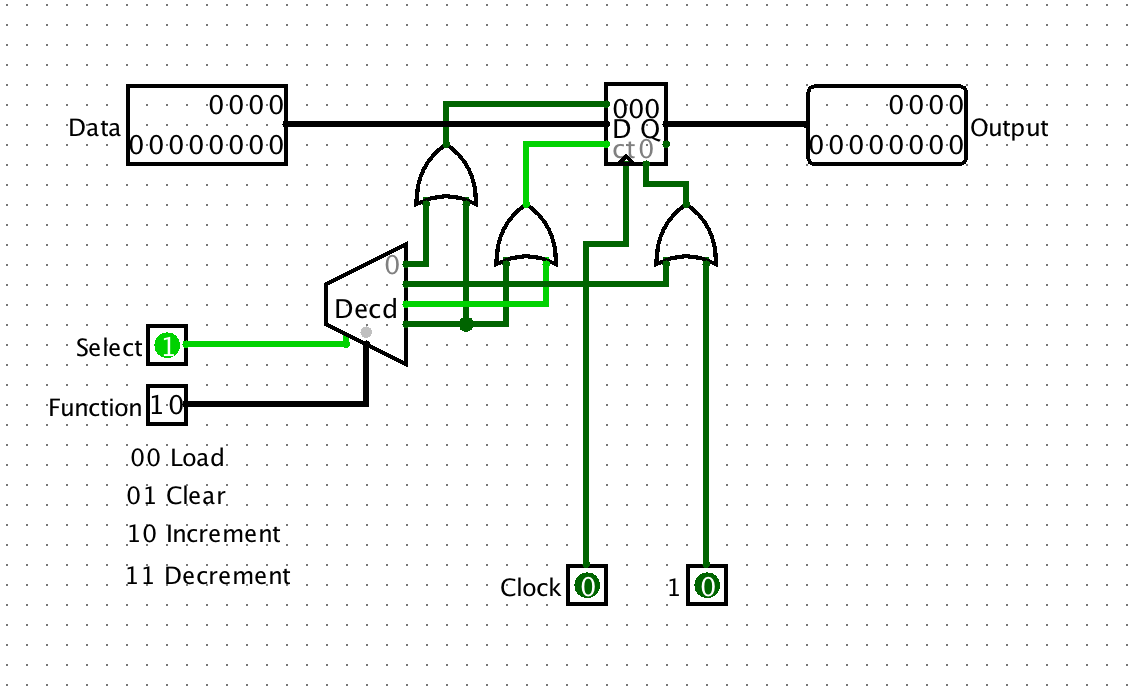 Thus the three or gates below the memory are used to correctly enable the memory inputs for these four conditions. Study them carefully, and then add them
